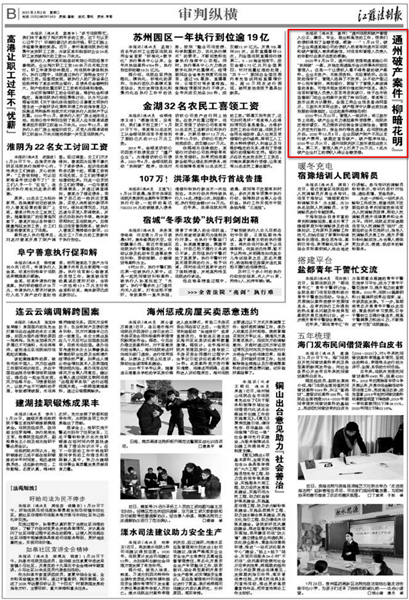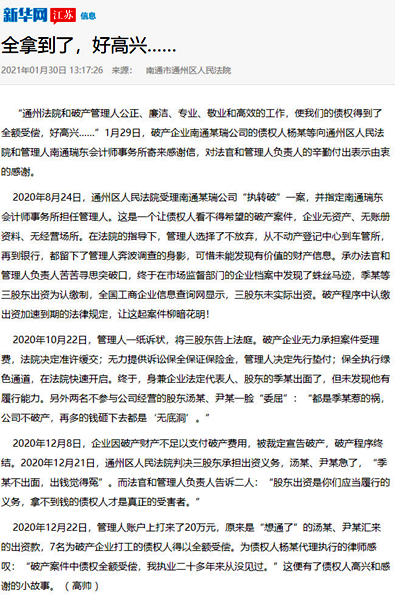 江蘇法制報(bào)截圖 近日“南通瑞東會計(jì)師事務(wù)所”的名字,不斷出現(xiàn)在《新華網(wǎng)》《江蘇法制報(bào)》的報(bào)道之中。一個小會所名字出現(xiàn)到主流新聞媒體中,實(shí)屬罕見。這要從我所承辦的一起破產(chǎn)案件說起。 2020年8月24日,通州區(qū)人民法院受理南通某瑞公司“執(zhí)轉(zhuǎn)破”一案,并指定南通瑞東會計(jì)師事務(wù)所擔(dān)任管理人。這是一個典型的企業(yè)無資產(chǎn)、無賬冊資料、無經(jīng)營場所的三無企業(yè),債權(quán)人看不到任何受償希望的破產(chǎn)案件。 南通瑞東會計(jì)師事務(wù)所由多名專業(yè)人員組成的清算組,主任會計(jì)師吳林海親自帶隊(duì)。在承辦法院的指導(dǎo)下,管理人從不動產(chǎn)登記中心到車管所,再到銀行,四處奔波,全方位開展資產(chǎn)調(diào)查工作,可惜仍未能發(fā)現(xiàn)有價(jià)值的財(cái)產(chǎn)信息。管理人團(tuán)隊(duì)苦苦尋思突破口,仔細(xì)尋找蛛絲馬跡,終于在稅務(wù)局申報(bào)表和市場監(jiān)督部門的企業(yè)檔案中發(fā)現(xiàn)了有益線索。原來債務(wù)人公司季某等三股東出資為認(rèn)繳制,全國工商企業(yè)信息查詢網(wǎng)顯示,三股東均未實(shí)際出資。根據(jù)企業(yè)進(jìn)入破產(chǎn)程序股東認(rèn)繳出資加速到期的法律規(guī)定,讓這起案件柳暗花明! 2020年10月22日,管理人一紙?jiān)V狀,將三股東告上法庭在申請?jiān)V訟保全后,債務(wù)人企業(yè)無力提供訴訟保全保證保險(xiǎn)金的情況下管理人毅然決然決定有管理人機(jī)構(gòu)自己先行墊付,申請法院進(jìn)行了保全保全。終于,身兼企業(yè)法定代表人、股東的季某出面了,但未發(fā)現(xiàn)他有履行能力。另外兩名不參與公司經(jīng)營的股東湯某、尹某一臉“委屈”:“都是季某惹的禍,公司不破產(chǎn),再多的錢砸下去都是‘無底洞’。但是法律是公正的,2020年12月21日,通州區(qū)人民法院判決三股東必須承擔(dān)出資義務(wù)。管理人負(fù)責(zé)人告知被告“股東出資是你們應(yīng)當(dāng)履行的義務(wù),拿不到錢的債權(quán)人才是真正的受害者!逼扔诜傻耐,2020年12月22日,“想通了”的湯某、尹某向管理人賬戶打來了20萬元,最終, 7名打工人員全額拿回血汗錢! “破產(chǎn)管理人專業(yè)、敬業(yè)和高效的工作,使我們的債權(quán)得到了全額受償,好高興……”1月29日,破產(chǎn)企業(yè)南通某瑞公司的債權(quán)人楊某等向管理人南通瑞東會計(jì)師事務(wù)所寄來感謝信,對管理人的辛勤付出表示由衷的感謝。 為債權(quán)人楊某代理執(zhí)行的律師感嘆:“破產(chǎn)案件中債權(quán)全額受償,我執(zhí)業(yè)二十多年來從沒見過! 盡職、盡力、盡心、盡我所能,維護(hù)債權(quán)人的利益、維護(hù)法律的權(quán)威這是南通瑞東會計(jì)師事務(wù)所作為破產(chǎn)管理人一貫堅(jiān)持的基本原則。所承辦案件得到債權(quán)人的認(rèn)可,得到法院的肯定,這是管理人的最大榮譽(yù)。 |