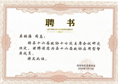 我所主任會計(jì)師吳林海同志被政協(xié)如東縣委員會2023年7月13日聘為縣十六屆政協(xié)應(yīng)用型智庫成員。